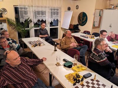 ![]() „Edeljoker“ Thoralf punktet. - Foto: Günter Schmidt Je gemütlicher es drinnen wurde, umso ungemütlicher war es auf den Brettern – zumindest für den Gegner. An Brett 5 versenkte Ulis fliegender Holländer das weiße Schiff des Landesspielleiters nach Figurengewinn im 20. Zug. Das blieb am Nachbarbrett nicht unbemerkt, wo Udo beim englischen Frühstück zuerst die „Qualle“ und zum Nachtisch einen ganzen Turm verspeiste. Mit zwei Punkten Vorsprung ließ sich der einem königsindischen T(urm/iger)angriff am Brett 3 zum Opfer gefallene Springer von Wolfgang verkraften. Am Spitzenbrett verflüchtigten sich indes Marcos Siegchancen im Damengambit nach Tausch selbiger ins baldige Remis. Gleiches „drohte“ auch an Brett 3, doch der „englische Gentleman“ vom VFB gestattete sich im Endspiel einen Bauernfehler und damit Janek den Sieg. Unser extra von der Ostseeküste angereister „Edeljoker“ Thoralf zeigte am 8. Brett, dass Angelsächsisch nicht weit vom Platt ist, und machte seinen Gegner selbiges mit einer rustikalen Bauerngabel. Etwas filigraner ging es im Sizilianer am Brett des Autors zu, wo erst im 24. Zug(!) die ersten Bauern und 10 Züge später schon die Damen getauscht wurden, was mir ein komfortables Endspiel und den Sieg einbrachte. Deutlich am längsten streiten musste erneut Dirk. Obwohl seine „Sizilianische Vesper“ schon im 25. Zug ausbrach, musste er nochmal doppelt so lange kämpfen, bis sein Gegner im Angesicht von Matt durch Bauernumwandlung die Waffen streckte. Die 6½-Punkte mussten anschließend natürlich zu Speis und Trank im Gastraum „umgesetzt“ und die Partieformulare unseres Sponsors axilaris zur Analyse gezückt werden, wobei sich noch die ein oder andere Idee im Bier fand oder auflöste – je nachdem … |
