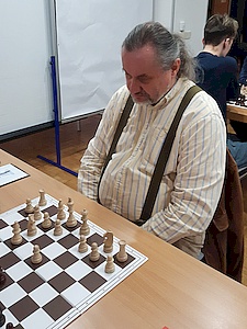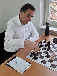 ![]() Udo eröffnet zum Punktereigen. - Foto: Günter Schmidt So remisierte Wolfgang am Spitzenbrett bereits nach 15 Zügen in total ausgeglichener Stellung gegen den stärksten „Springer“. Dank guter Vorbereitung brachte Udo sein Damenbauernspiel zügig aufs 3. Brett. Nach Bauerngewinn am Damenflügel konnte er eine 3:1-Bauernkonstellation alsbald in 2 verbundene Freibauern und damit in unseren ersten ganzen Punkt verwandeln. Währenddessen hatte sich mein Gegner im Benoni-Hauptsystem so verzettelt, dass mein Springer von f6 par force über d5, b4, d3 bis nach b2 reiten und dabei sämtliche weiße Bauern am Damenflügel von Brett 6 einsammeln konnte, bevor er notgedrungen selbst zum Opfer einer „Qualle“ wurde. Das drohende Grundreihenmatt konnte Weiß jedoch nicht mehr sinnvoll verhindern. Obwohl Dirks Gegner in der französischen Abtauschvariante die Rochade zugunsten wilder Springer(!)züge „vergessen“ hatte, war an seinem 5. Brett plötzlich die Qualität futsch. Glücklicherweise gab der Leipziger diese nicht rechtzeitig zurück und stattdessen nach Zeitüberschreitung auf. Mit 3½ Punkten auf unserem Konto ließ sich das nach langem Verteidigungskampf von Klaus verlorene 7. Brett verkraften. Uli musste seine unorthodox gespielte Eröffnung an „Vier“ erst schrittweise verbessern, bis ein zunächst unscheinbarer, das Abtauschgetümmel überlebender Freibauer trotz einiger „Racheschachs“ seinen unhaltbaren Weg zur Dame und damit zu unserem Mannschaftssieg fand. So konnten wir weiter entspannt verfolgen, wie Janek seinem früh gewonnenen Mehrbauern einen zweiten hinzugesellte, die beide innig verbunden durchs Zentrum des 2. Brettes marschierten. Zwar erreichten sie, wiederum wegen mehrerer weißer „Racheschachs“, nur Reihe 3, doch baute sich der zwangsgetriebene schwarze Monarch plötzlich vor seinem Kontrahenten zu einer Mattfalle auf. Dagegen blieb Jörgs Partie am 8. Brett trotz längstem Kampf immer in der Remisbreite. Sein halber Zähler zum 2:6 Endstand könnte für die Abschlusstabelle noch wichtig sein, sind wir doch jetzt die Mannschaft mit den meisten Brettpunkten. Mögen zur nächsten Runde am 14.4. noch einige dazukommen! |